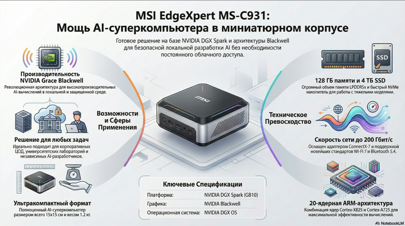 Устройство разработано на базе передовой платформы NVIDIA DGX Spark и объединяет в себе революционную вычислительную мощность новейшего чипа NVIDIA Grace Blackwell с бескомпромиссной надёжностью и качеством исполнения от MSI.